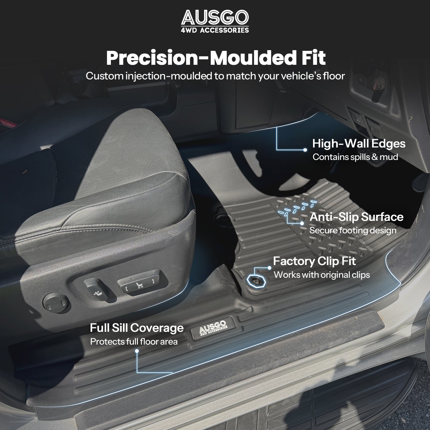- Perfect Fit: Laser-measured and precision-moulded to seamlessly cover the floor, edges, door sills, and under-seat areas.