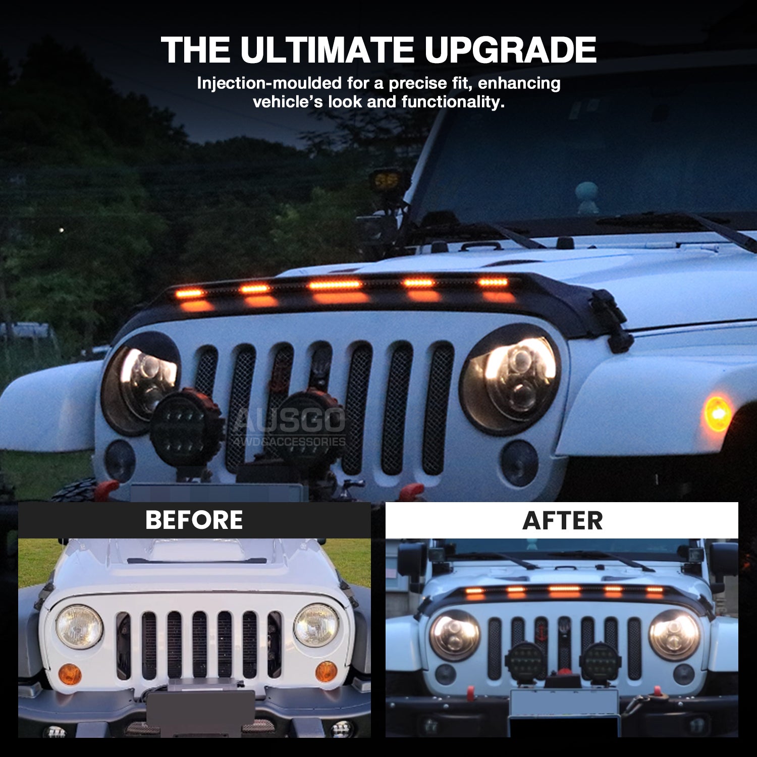 Enhance the look and protection of your Wrangler with this LED light bonnet protector guard. Designed to integrate with your vehicle’s steering lights, it provides an upgraded appearance while offering durable protection against debris, rocks, and scratches.